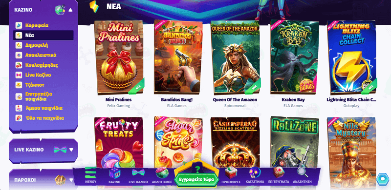 Πάροχοι Felix Gaming, Fugaso, Play’n GO, Big Time Gaming, Red Tiger Gaming, Yggdrasil Gaming, NetEnt, Microgaming, Betsoft, Elk Studios, Spinomenal, Quickspin, Amatic Industries, Relax Gaming, Evolution Gaming, iSoftBet, Endorphina, Playtech, Oryx