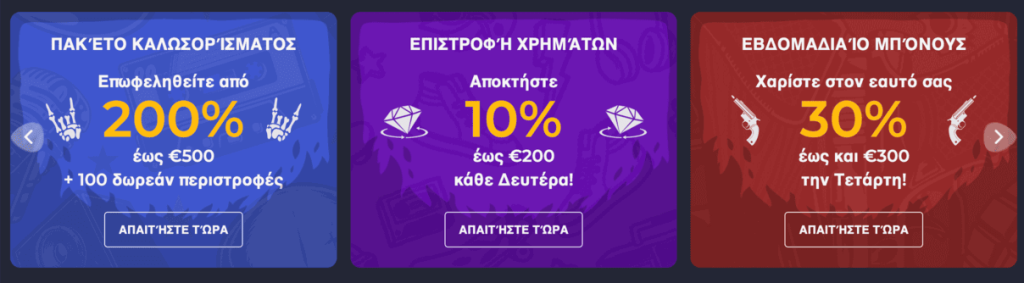 Εβδομαδιαίο Μπόνους Επαναφόρτωσης: Κάθε Τετάρτη μέχρι τις 23:59, οι παίκτες μπορούν να λάβουν έναν 30% Εβδομαδιαίο Μπόνους Επαναφόρτωσης έως και €300, αν καταθέσουν τουλάχιστον €20.